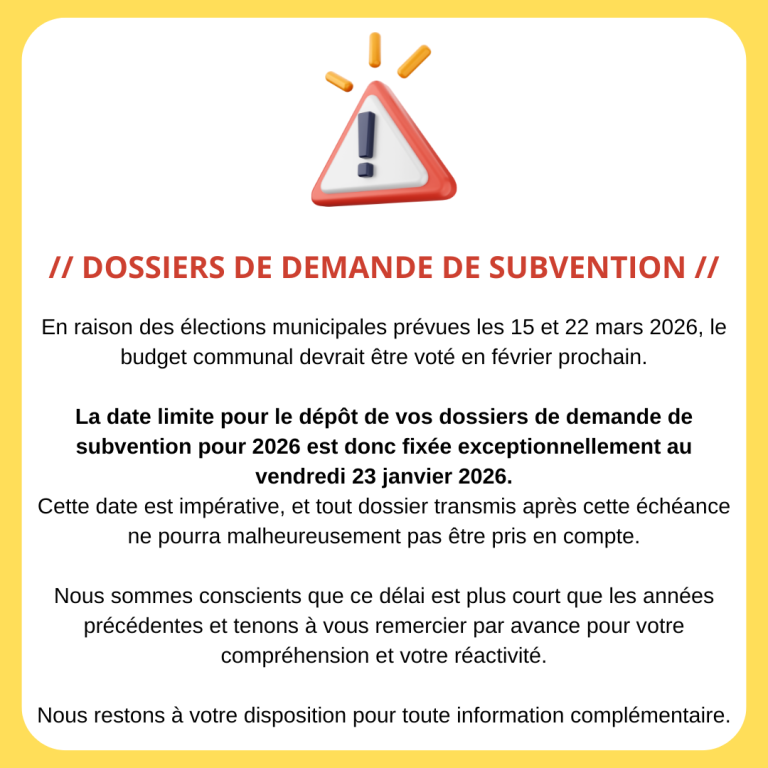 En raison des élections municipales prévues les 15 et 22 mars 2026, le budget communal devrait être voté en février prochain. La date limite pour le dépôt de vos dossiers de demande de subvention pour 2026 est donc fixée exceptionnellement au vendredi 23 janvier 2026 (lien de téléchargement ouvert et accessible : https://www.severacdaveyron.fr/culture-sport-et-loisirs/associations/) Cette date […]