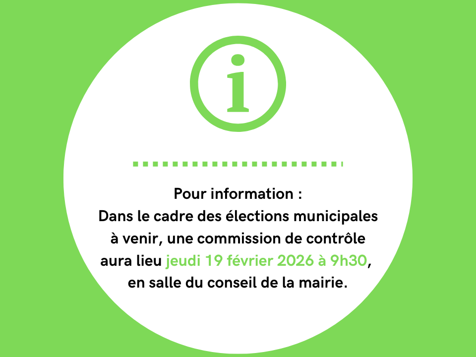 Dans le cadre des élections municipales à venir, une commission de contrôle aura lieu jeudi 19 février 2026 à 9h30, en salle du conseil de la mairie.