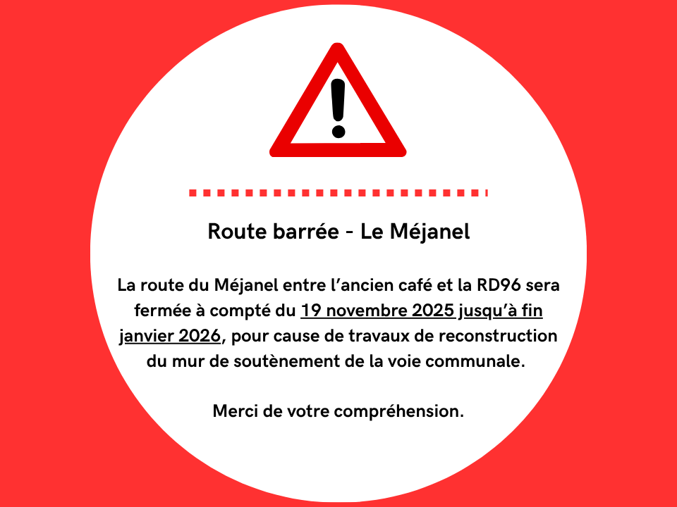 La route du Méjanel entre l’ancien café et la RD96 sera fermée à compté du 19 novembre 2025 jusqu’à fin janvier 2026, pour cause de travaux de reconstruction du mur de soutènement de la voie communale.